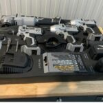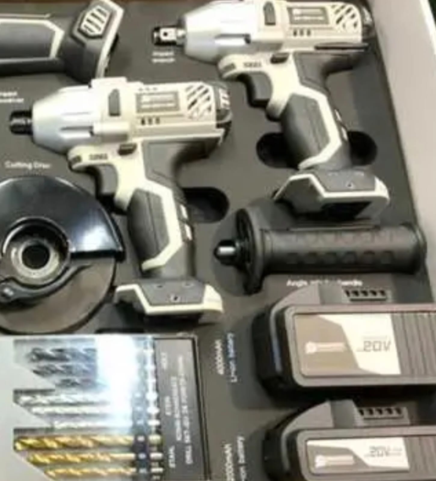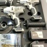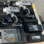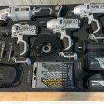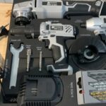 Zawiera cztery narzędzia: wiertarka, zakrętarka, klucz udarowy oraz szlifierka kątowa.