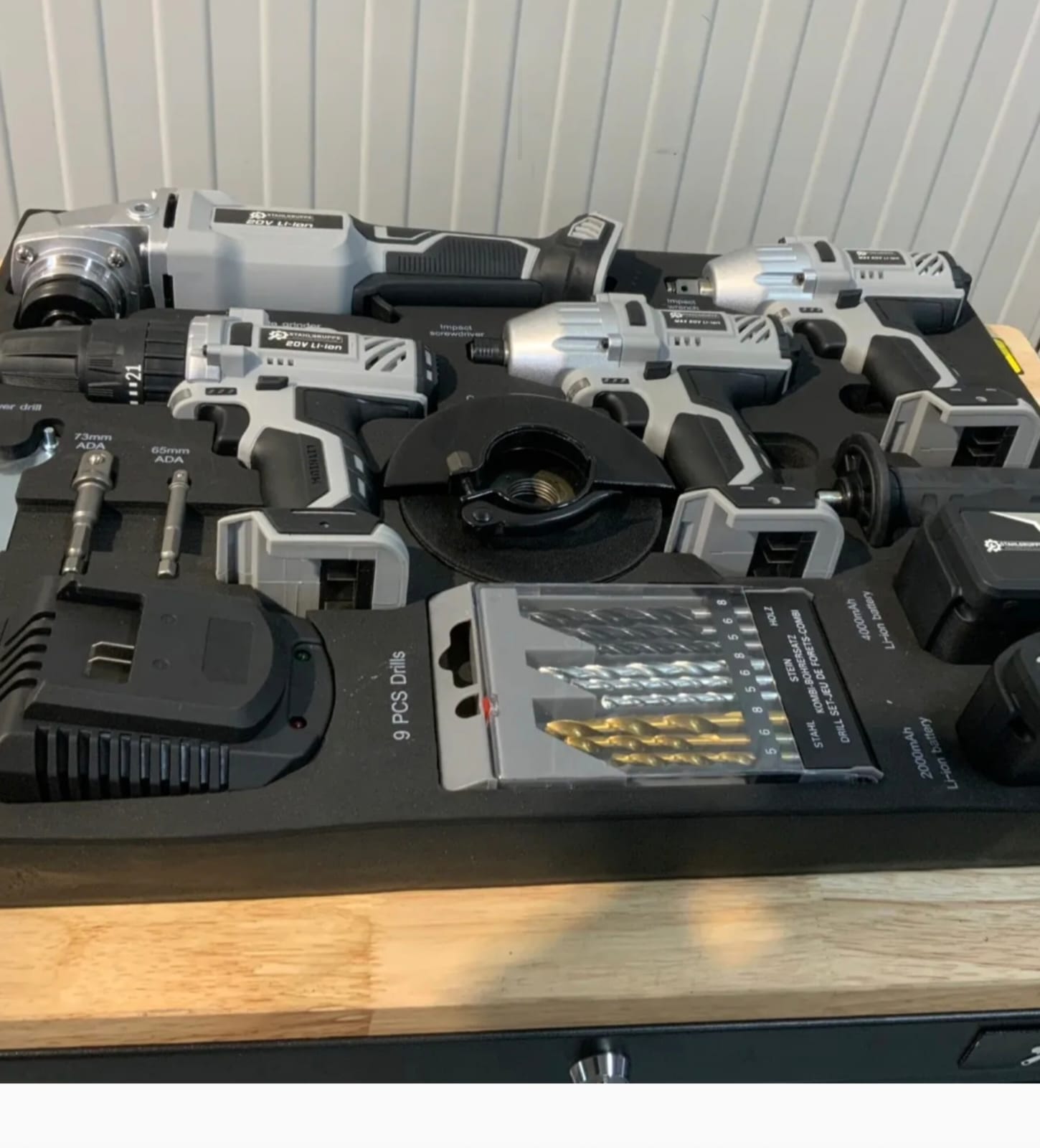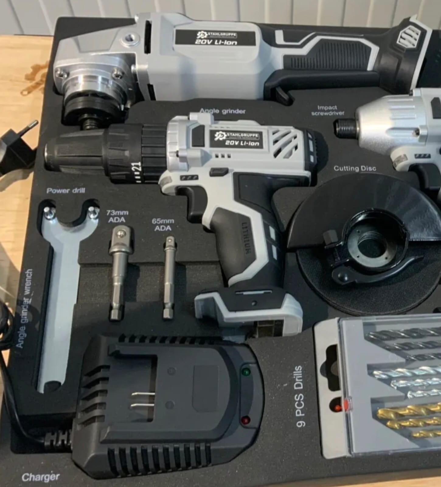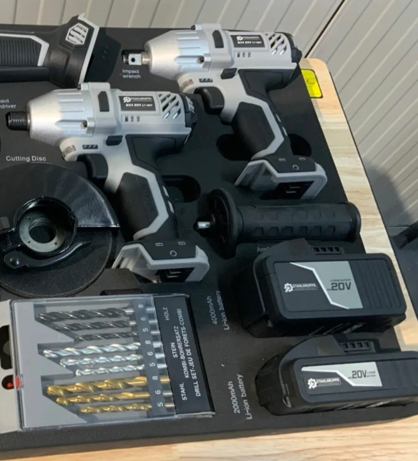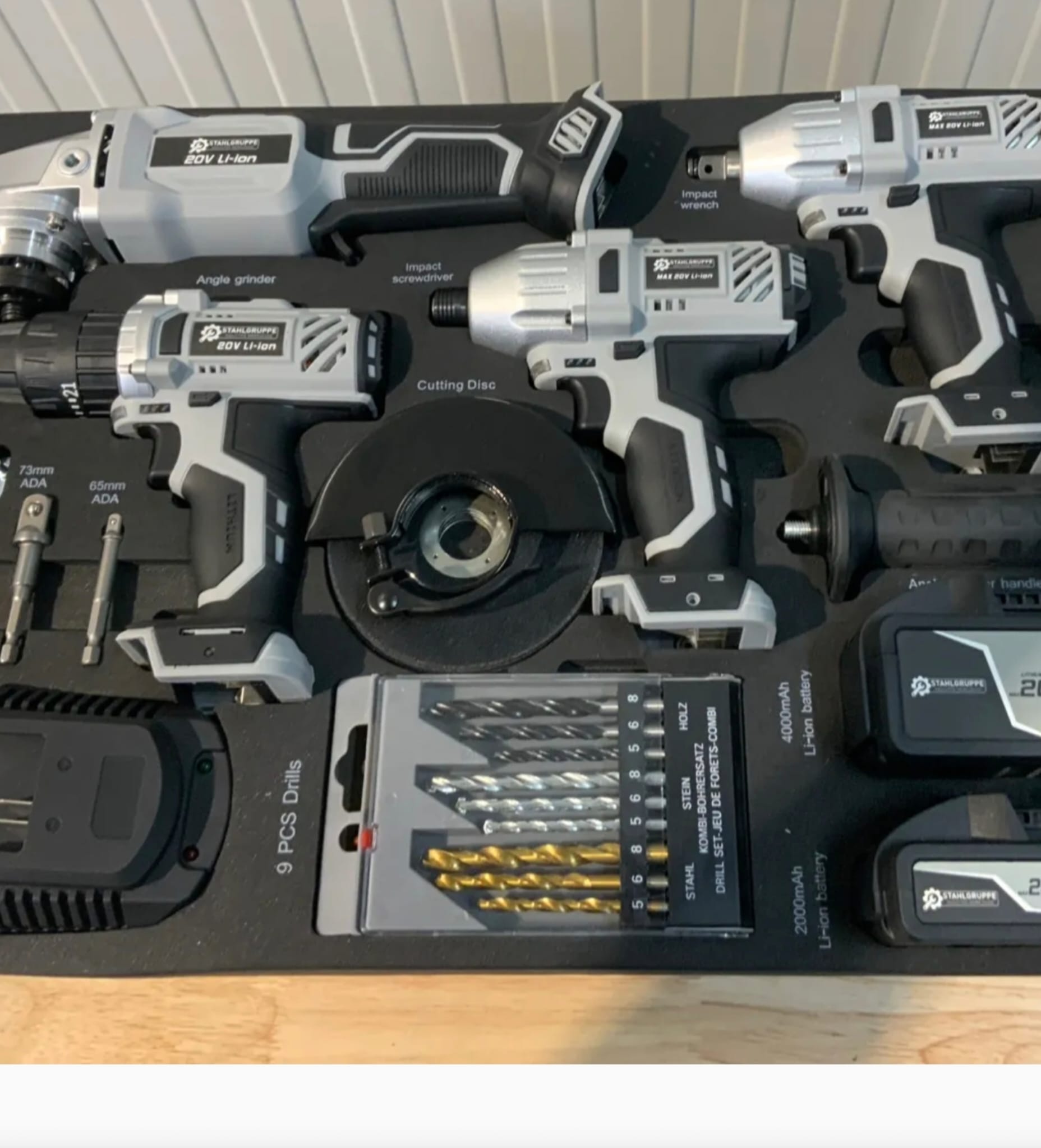Zestaw wysokiej jakości elektronarzędzi marki Stahllgruppe, w skład którego wchodzą m.in. wiertarka, szlifierka kątowa, wkrętarka akumulatorowa oraz zakrętarka.